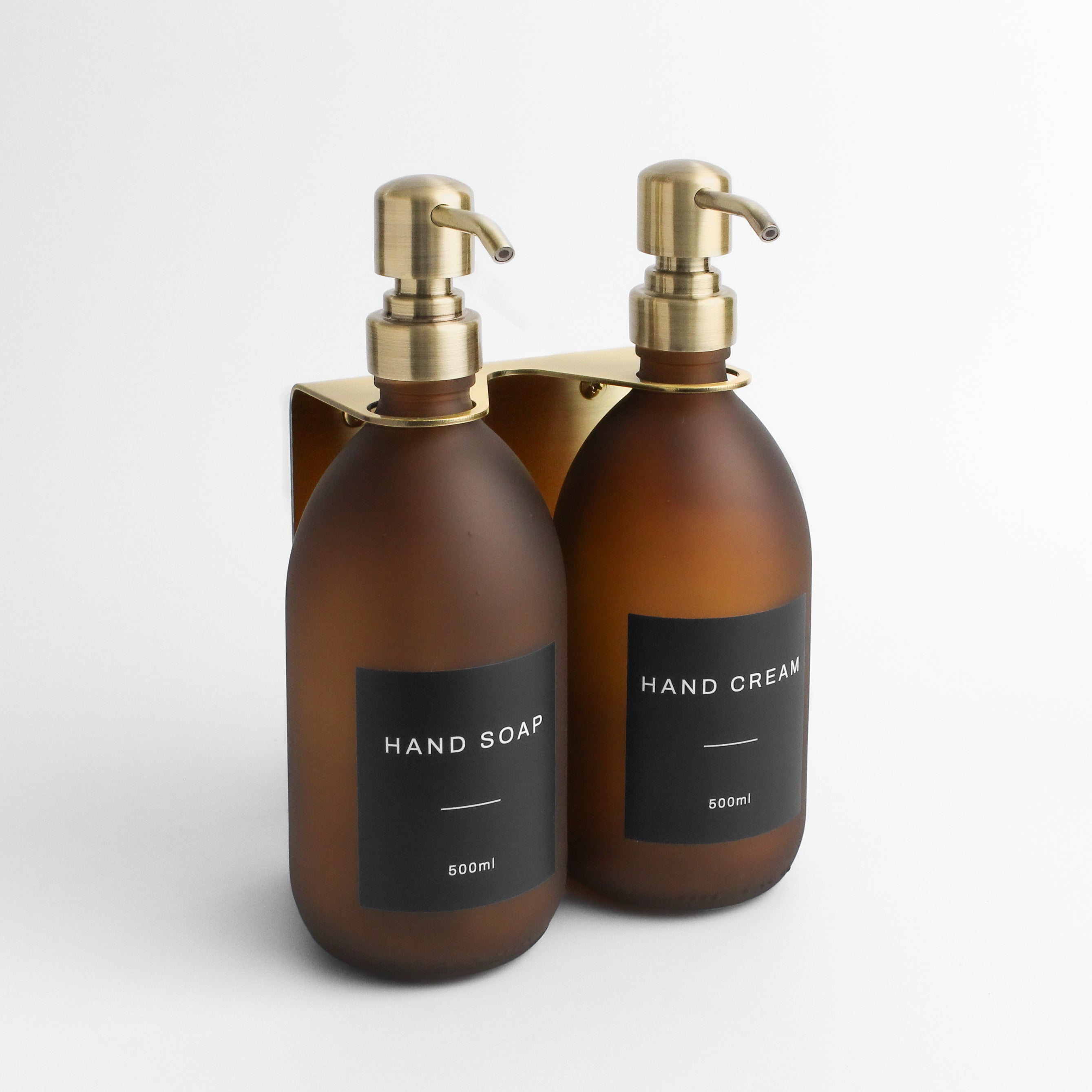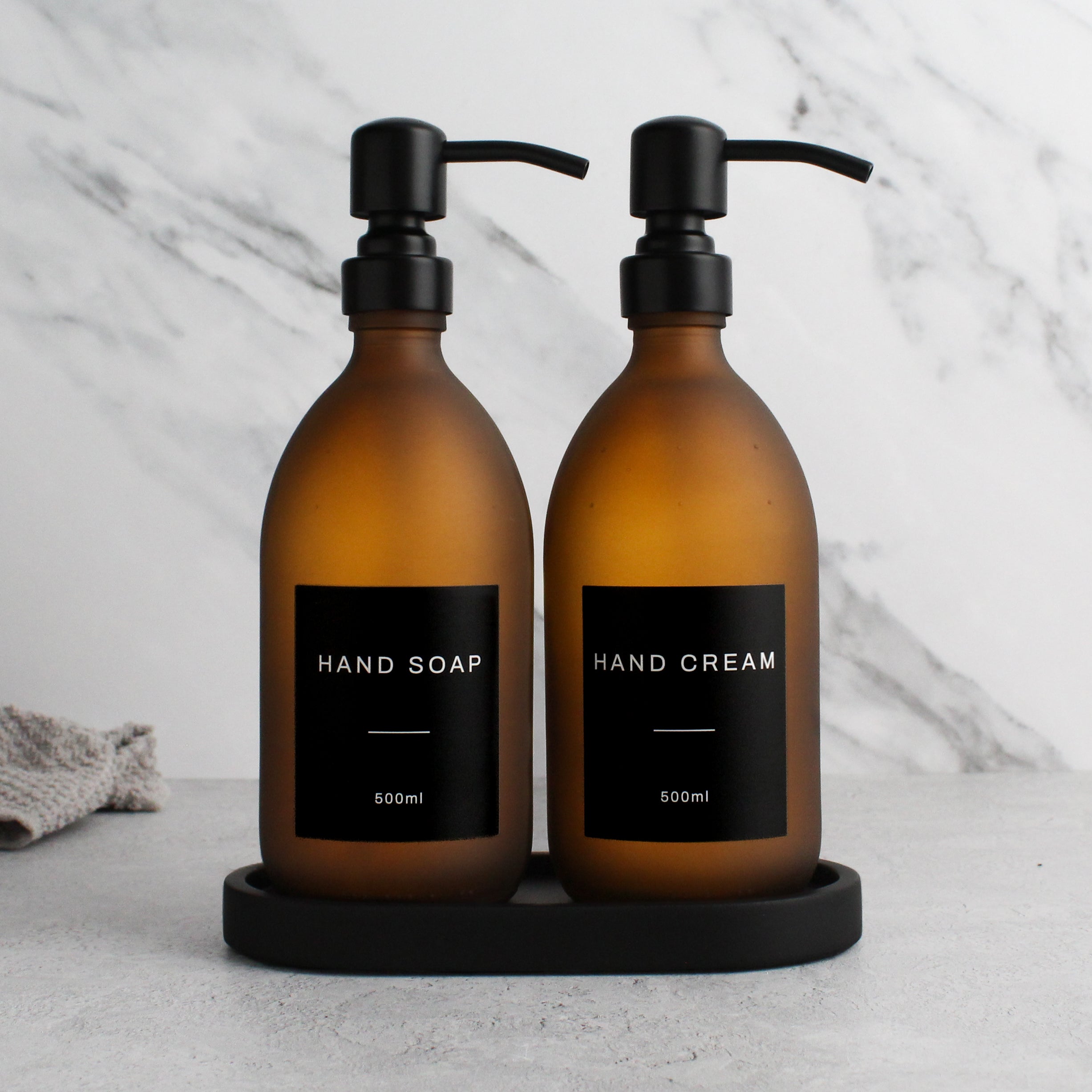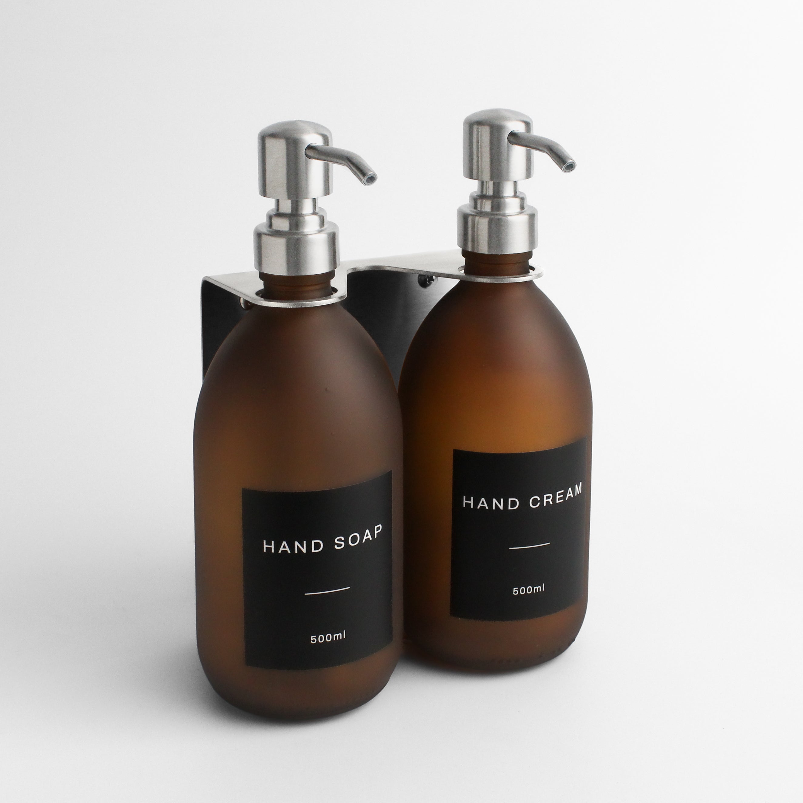 Our dispensers are for hand soap, dish soap, and hand cream in kitchens, and also perfect for body wash, shampoo and conditioner in bathrooms. Our popular tray sets are also available along with premium wall bracket sets. Glass colours range from amber, matte black, frosted white, and clear glass. There are also pump finishes to choose from such as gold, silver, matte black, and rose gold to match your home.