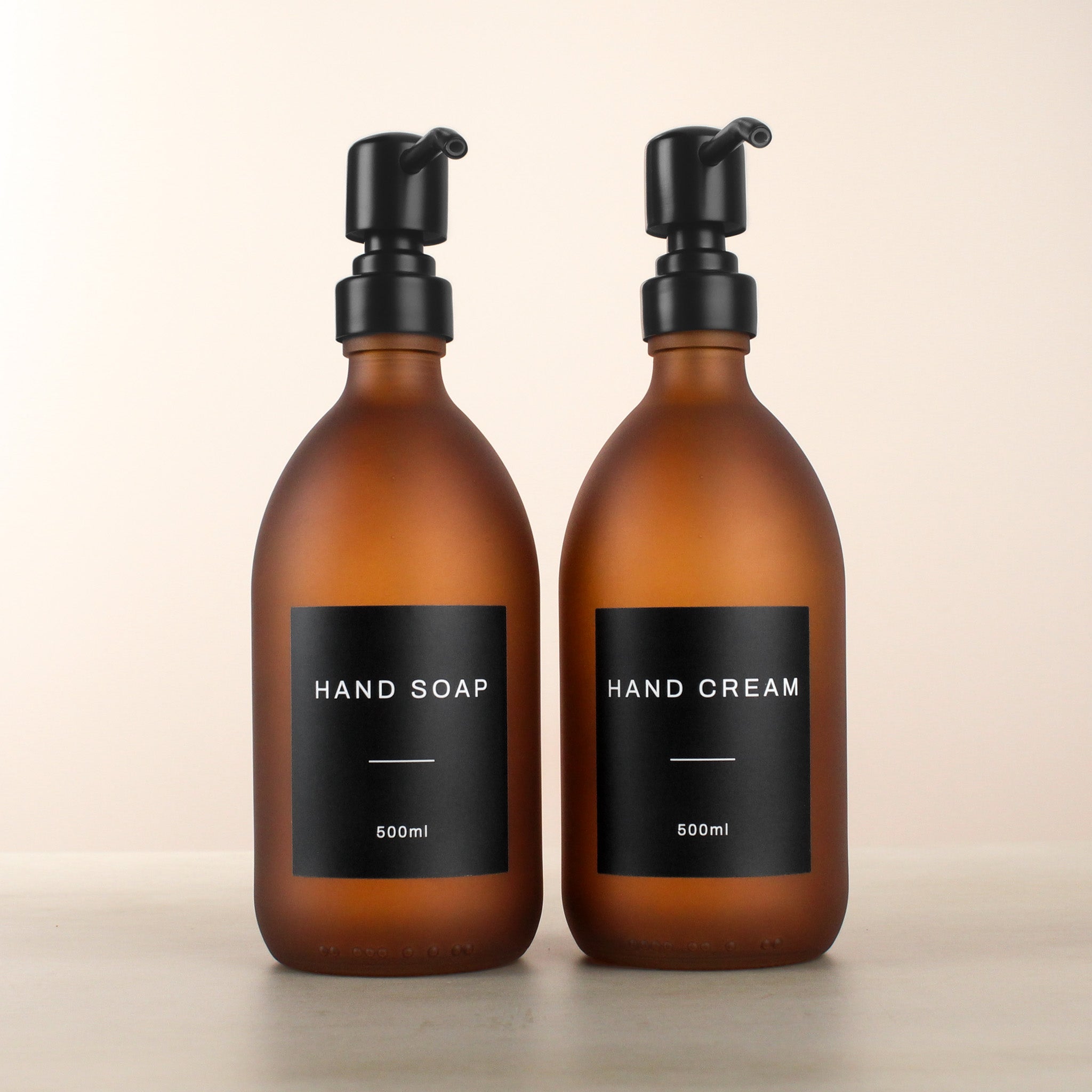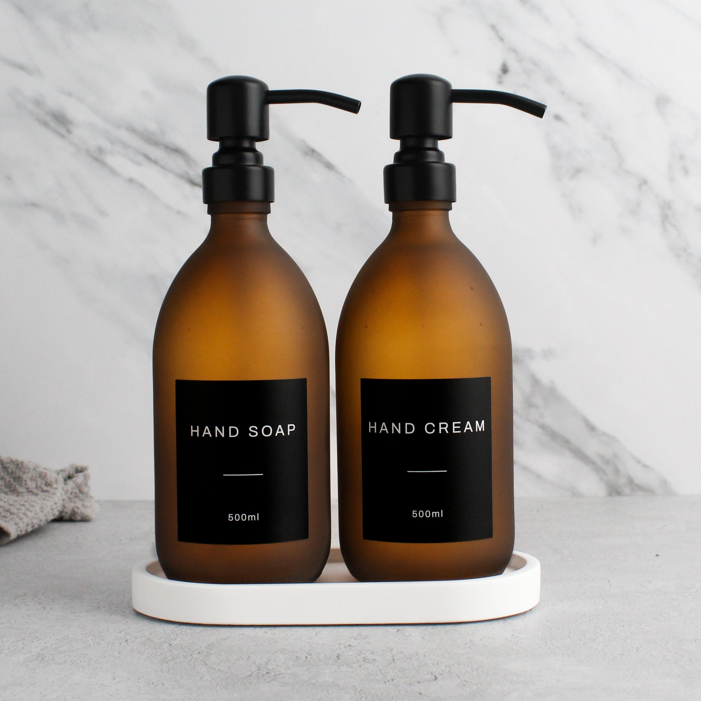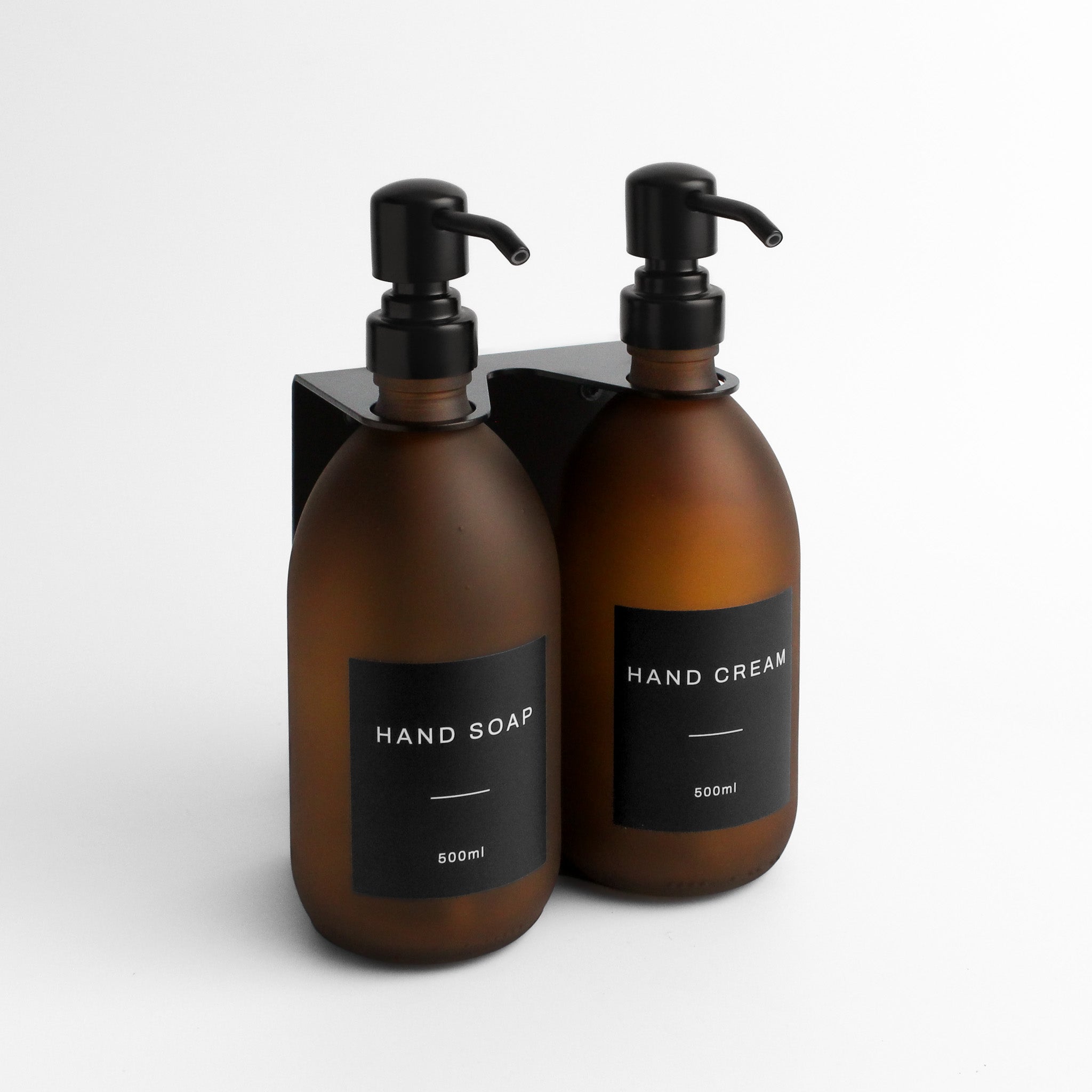 Our dispensers are for hand soap, dish soap, and hand cream in kitchens, and also perfect for body wash, shampoo and conditioner in bathrooms. Our popular tray sets are also available along with premium wall bracket sets. Glass colours range from amber, matte black, frosted white, and clear glass. There are also pump finishes to choose from such as gold, silver, matte black, and rose gold to match your home.
