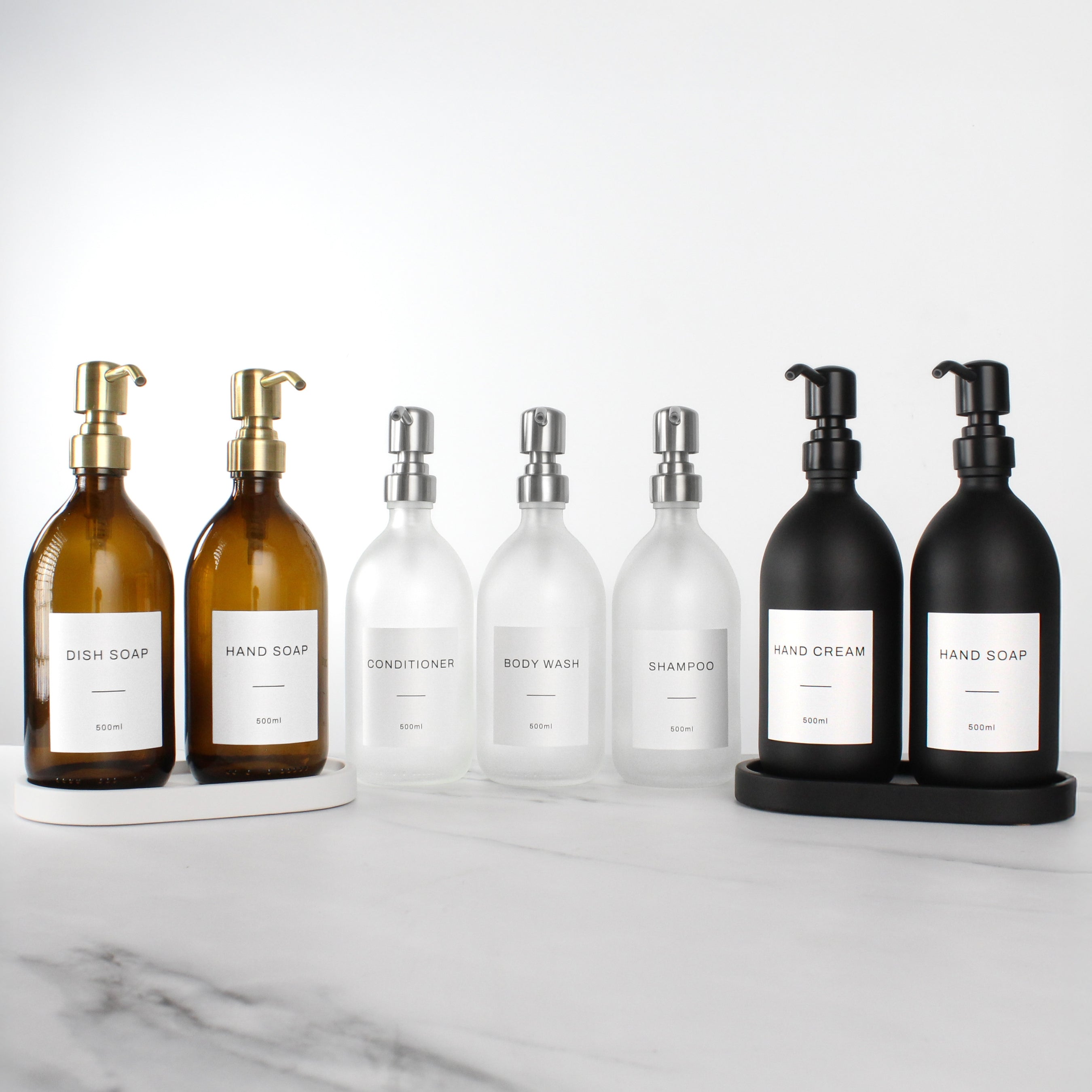 Our dispensers are for hand soap, dish soap, and hand cream in kitchens, and also perfect for body wash, shampoo and conditioner in bathrooms. Our popular tray sets are also available along with premium wall bracket sets. Glass colours range from amber, matte black, frosted white, and clear glass. There are also pump finishes to choose from such as gold, silver, matte black, and rose gold to match your home.