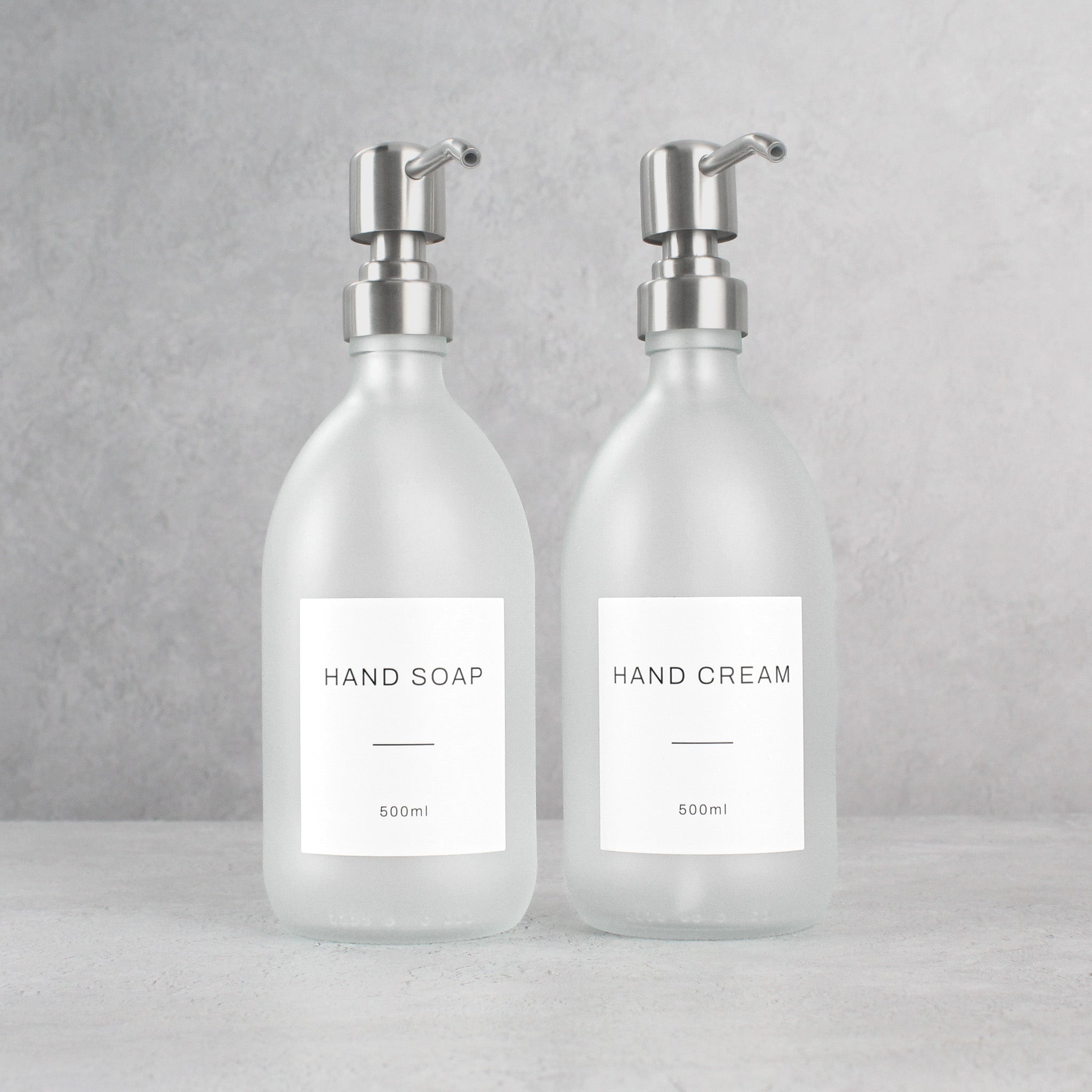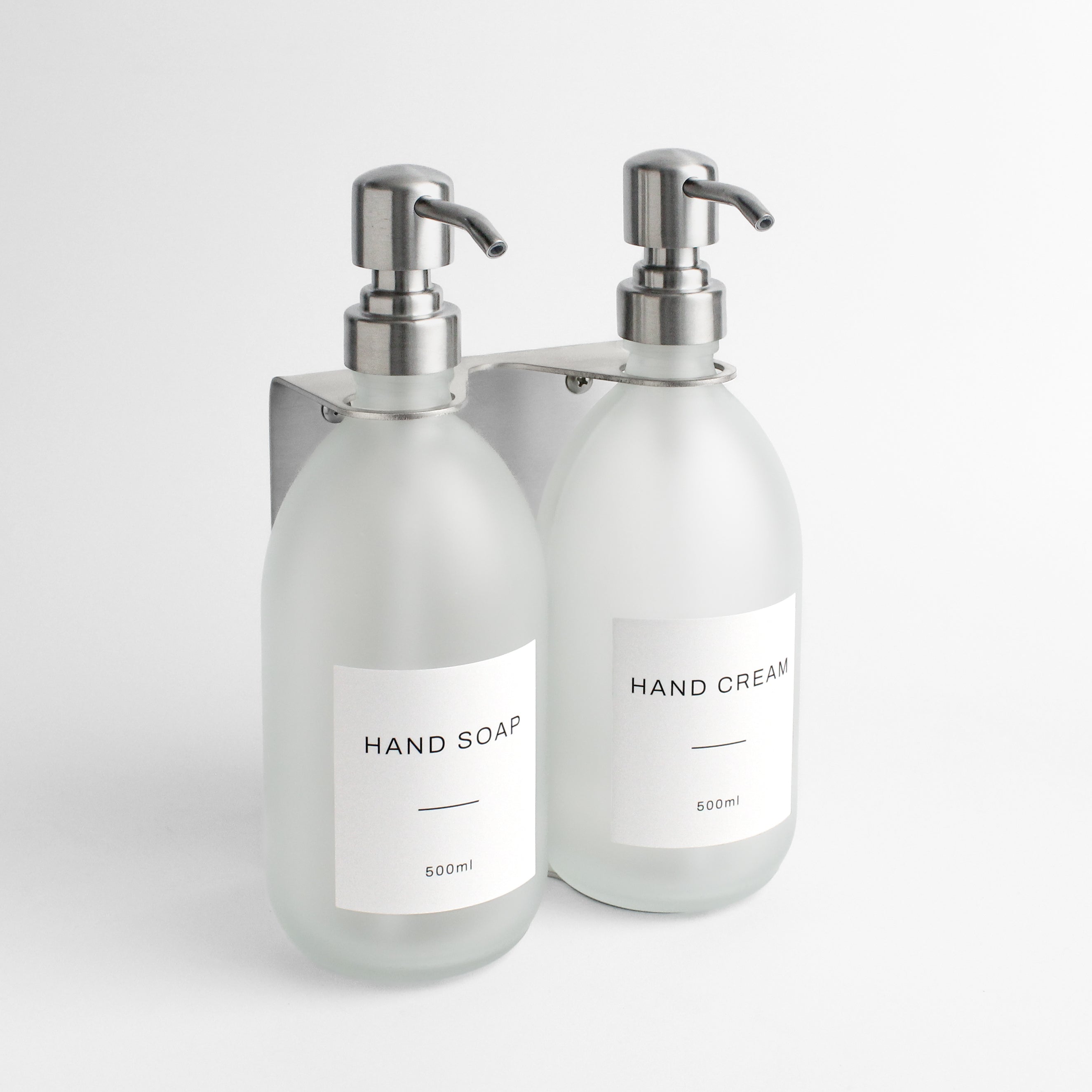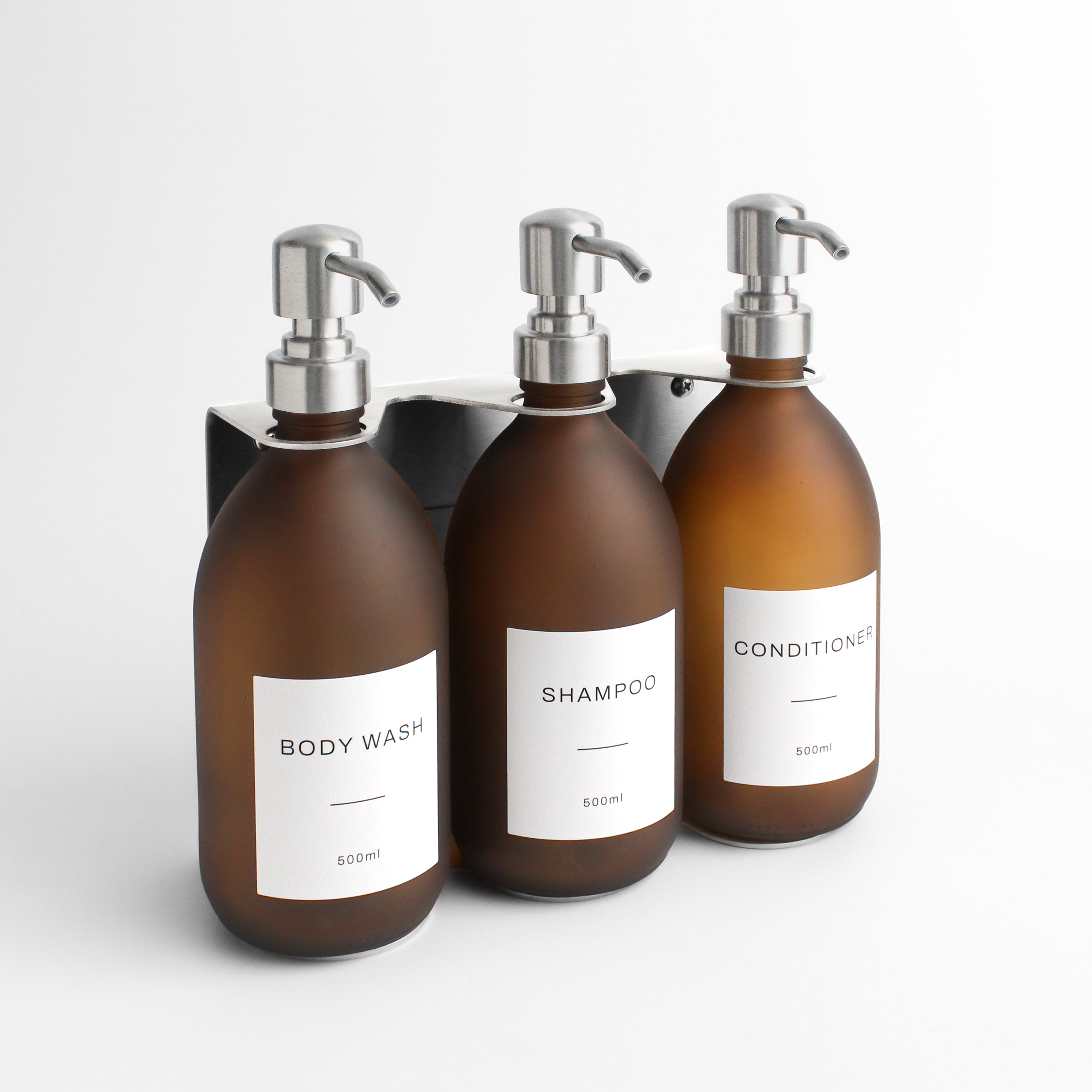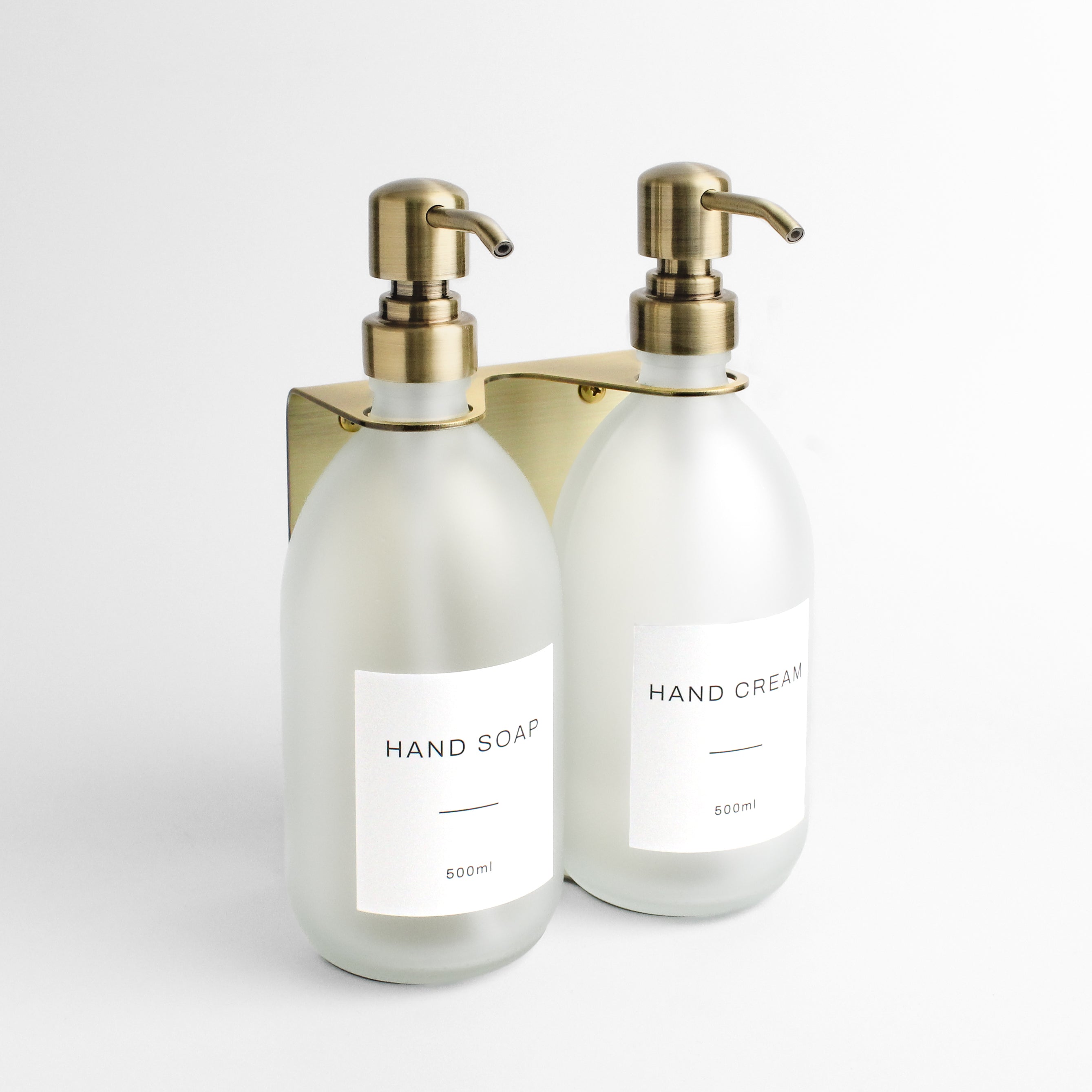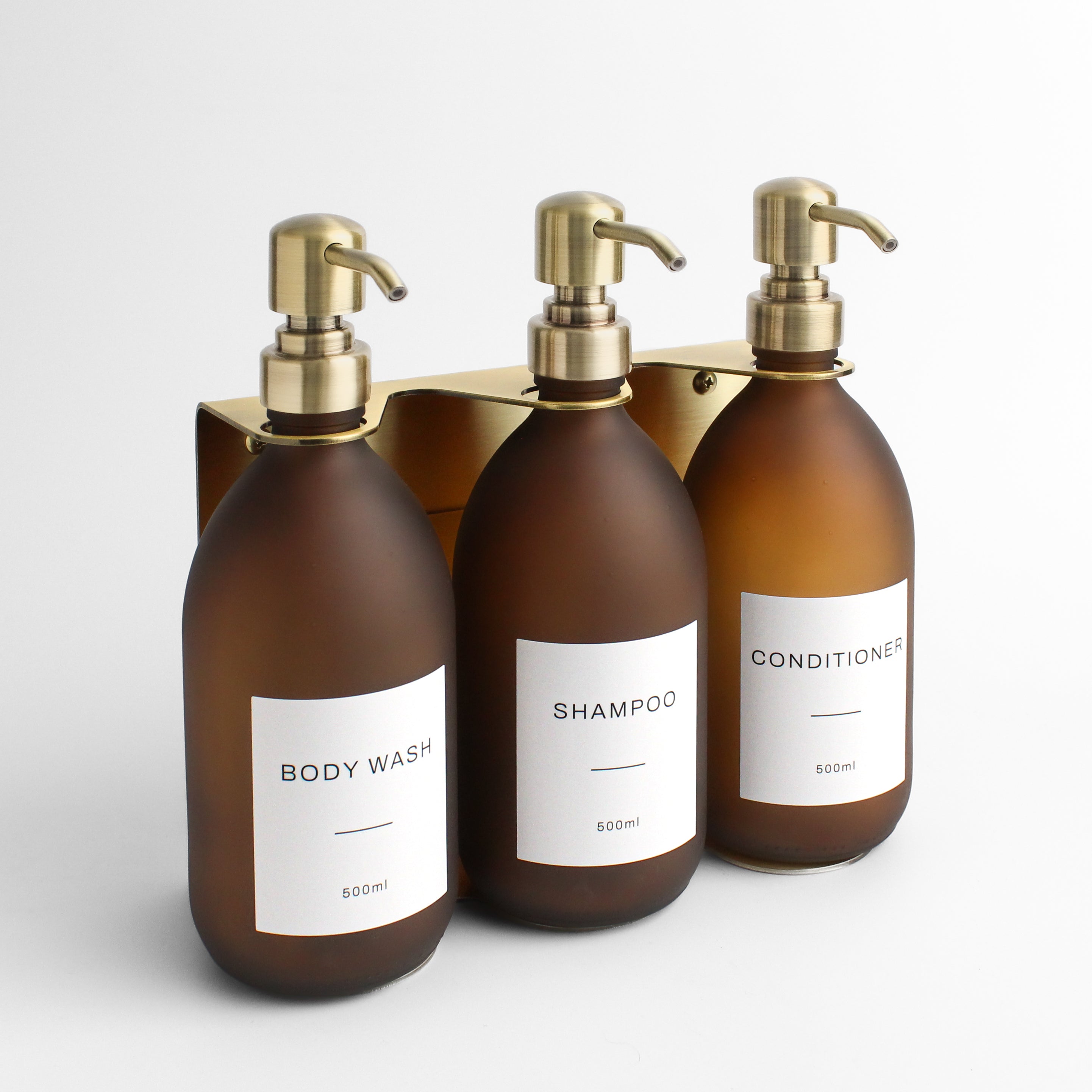 Our dispensers are for hand soap, dish soap, and hand cream in kitchens, and also perfect for body wash, shampoo and conditioner in bathrooms. Our popular tray sets are also available along with premium wall bracket sets. Glass colours range from amber, matte black, frosted white, and clear glass. There are also pump finishes to choose from such as gold, silver, matte black, and rose gold to match your home.