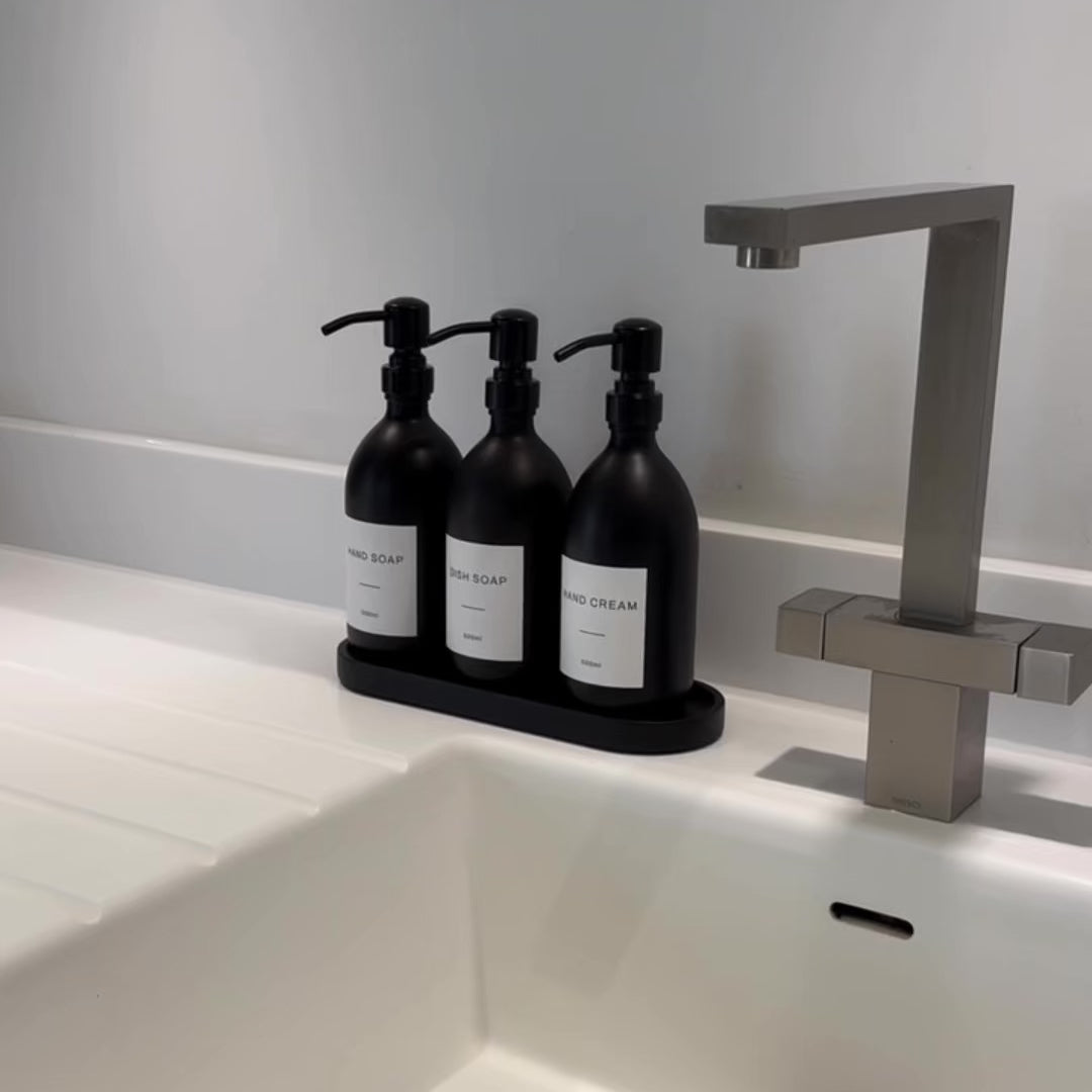 This Matte Black Glass Dispenser Triple Set, featuring a Black Concrete Tray, provides a stylish and practical solution for storing and dispensing soap. With a range of label and pump options, it ensures fragile items are kept safe on worktops and countertops in bathrooms and kitchens. Expertly designed and crafted, this set is a must-have for any home.