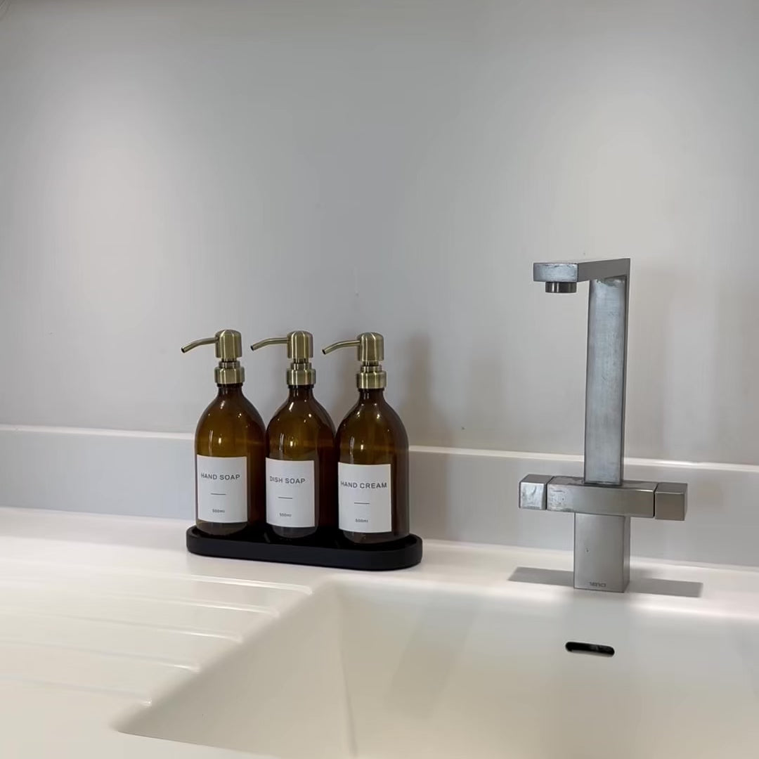 This Amber Glass Dispenser Triple Set, featuring a Black Concrete Tray, provides a stylish and practical solution for storing and dispensing soap. With a range of label and pump options, it ensures fragile items are kept safe on worktops and countertops in bathrooms and kitchens. Expertly designed and crafted, this set is a must-have for any home.