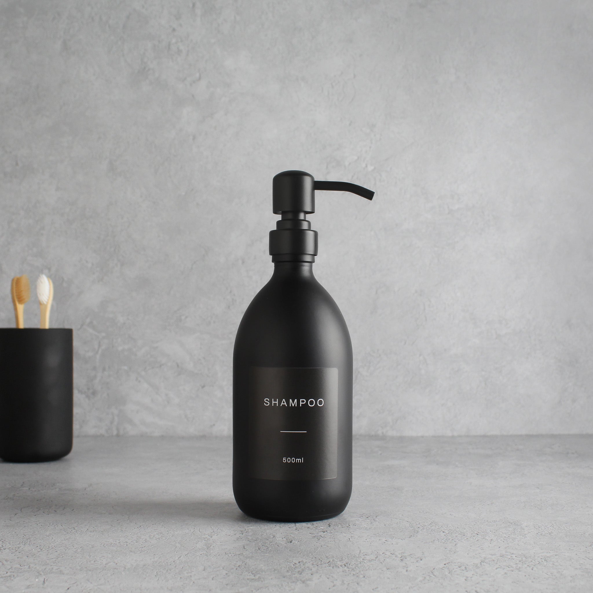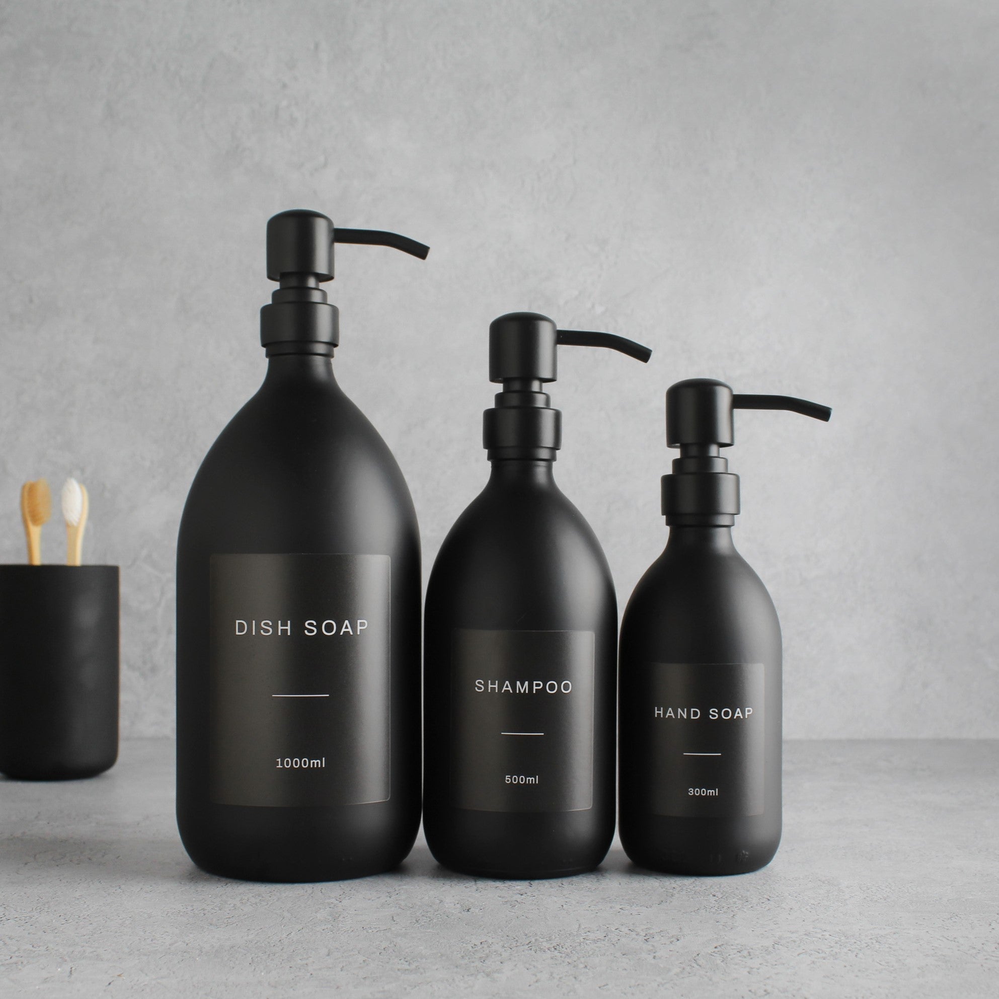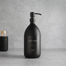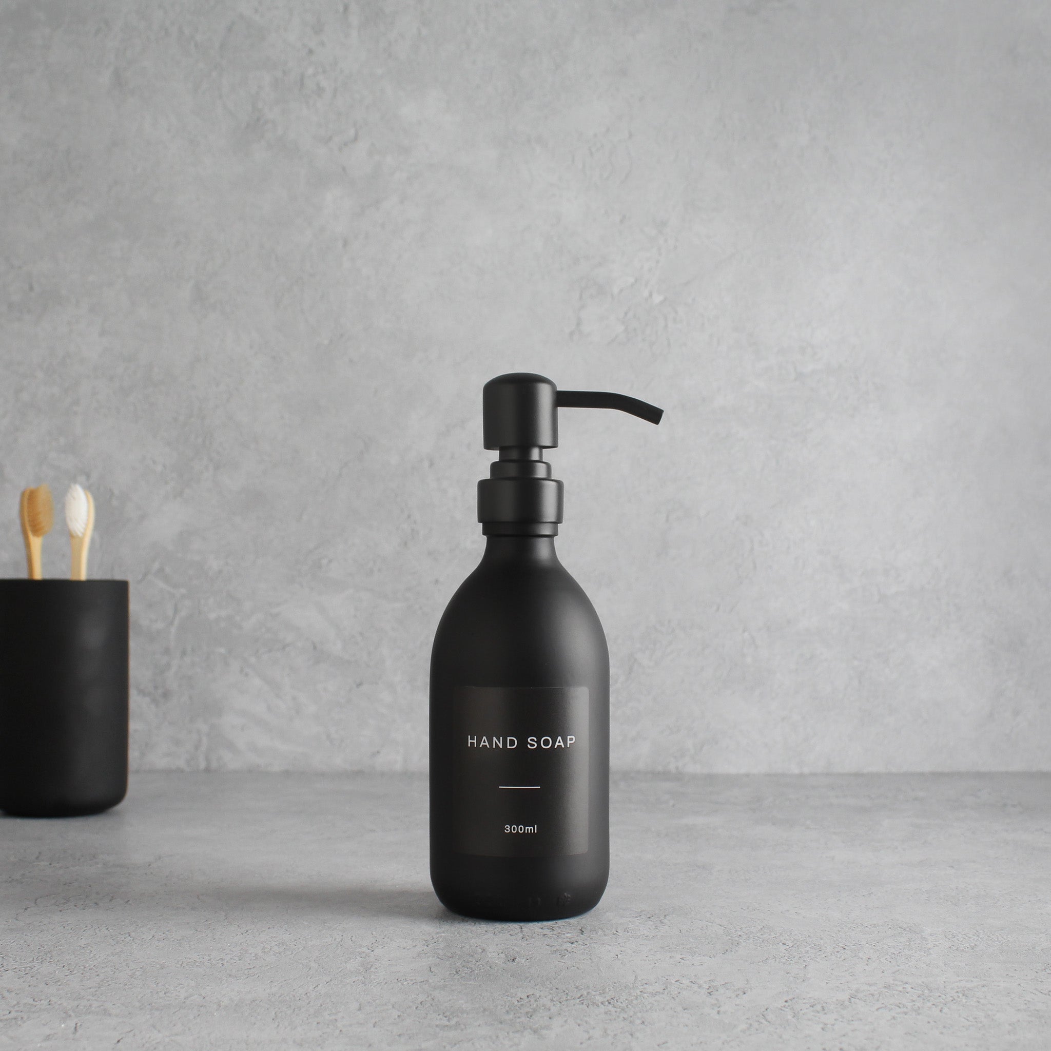 Labelled Matte Black Glass Dispenser Bottle With Matte Black Pump